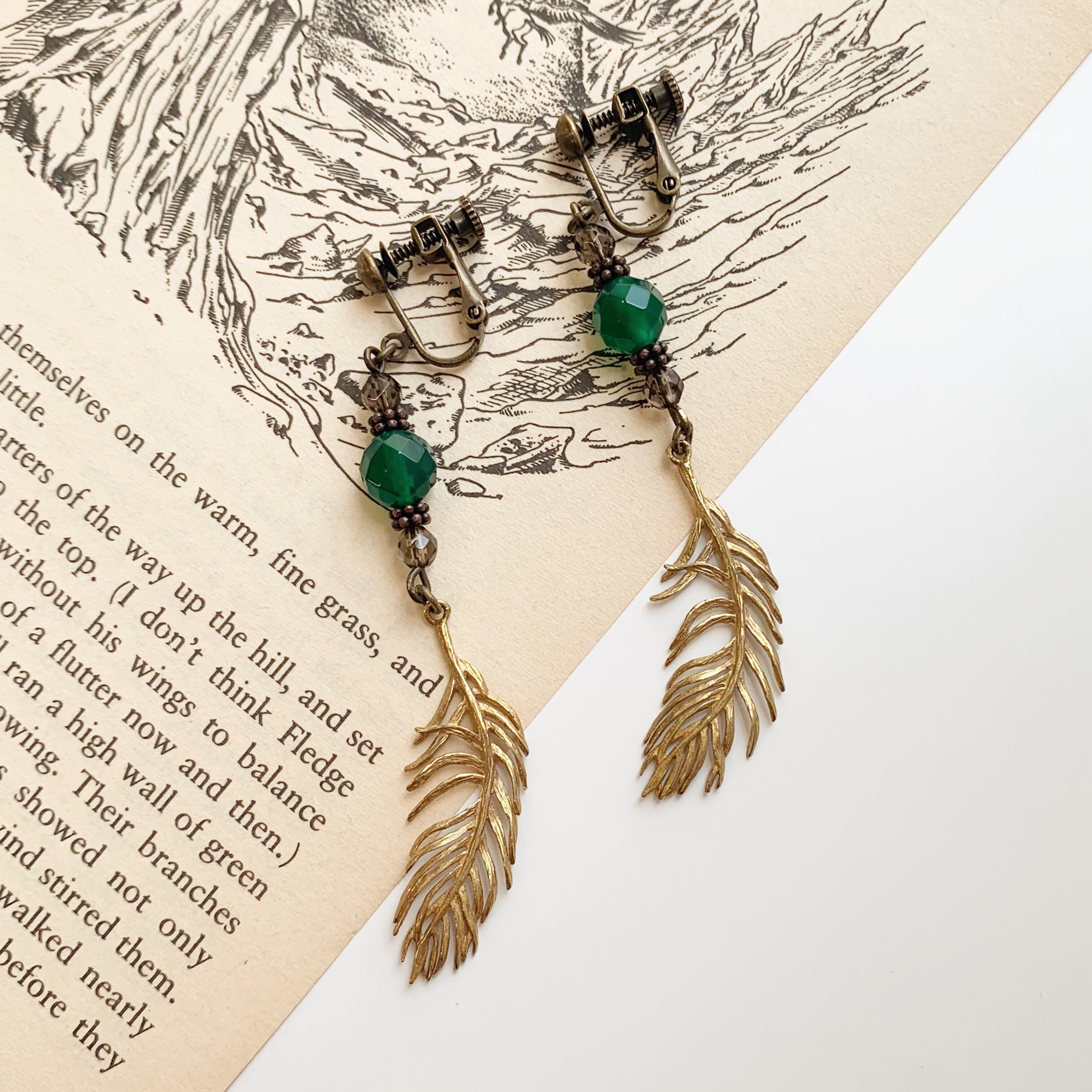 グリーンオニキス&スモーキークォーツ・羽根・イヤリング